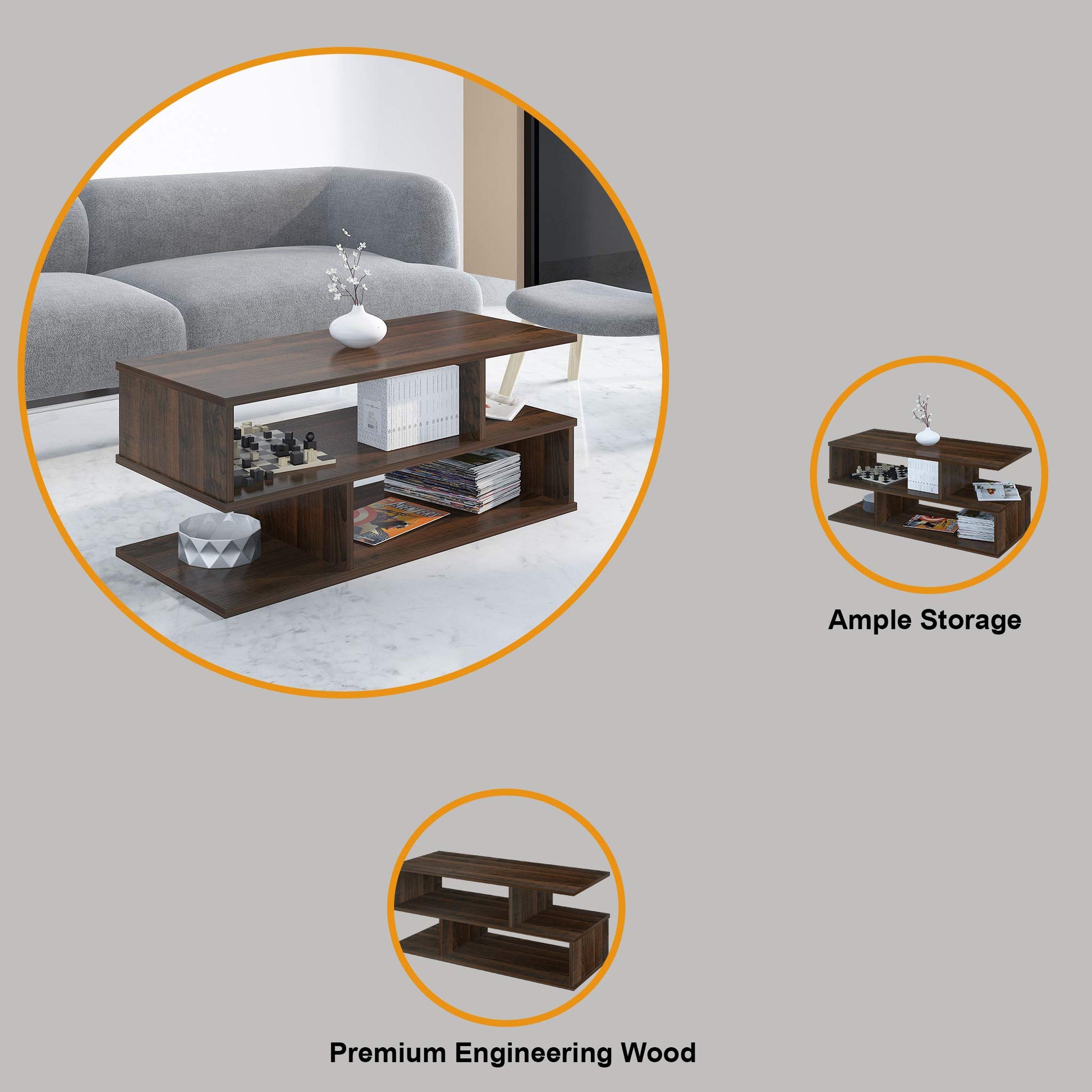 Make a bold statement in your living room with the S-Shape Coffee Table. This unique centre table, in a rich walnut finish, features a striking geometric "S" design that creates two levels of storage. It offers a spacious top surface for drinks and decor, and a lower shelf for magazines, books, or remote controls. This modern engineered wood tea table is a functional piece of art that will become the stylish centerpiece of your seating area.