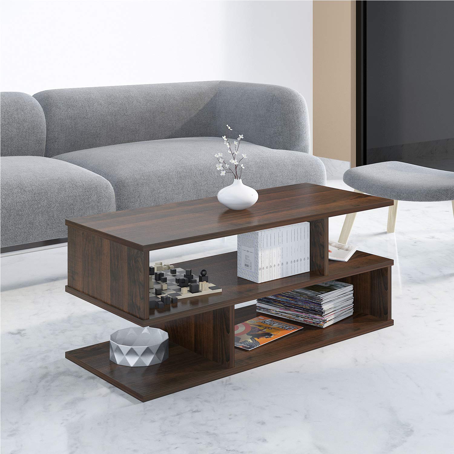 s-Shape Wood Coffee Table in Walnut, Modern Centre Table for Living Room, Tea Table with Lower Shelf, Unique Geometric Design, Two-Tier Storage