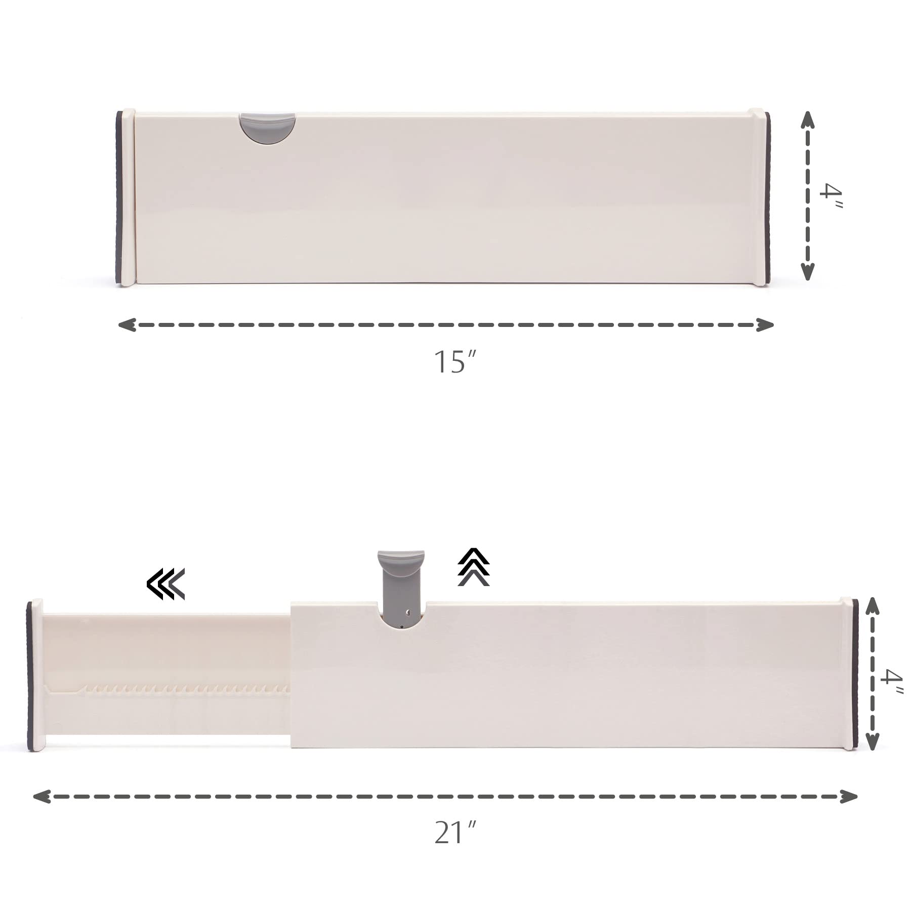 • Note: please check the size of your drawer!!! Size: height 4 inches and length adjustable from 15 to 21 inches (Suitable for 15.5 to 20.5 inches drawers). Material:Plastic. Strong Secure Hold, Locks in Place, Foam Ends. Adjustable slide and simple one-click installation with no tools or glues required; foam rubber pads grip strong without leaving any marks or residue.