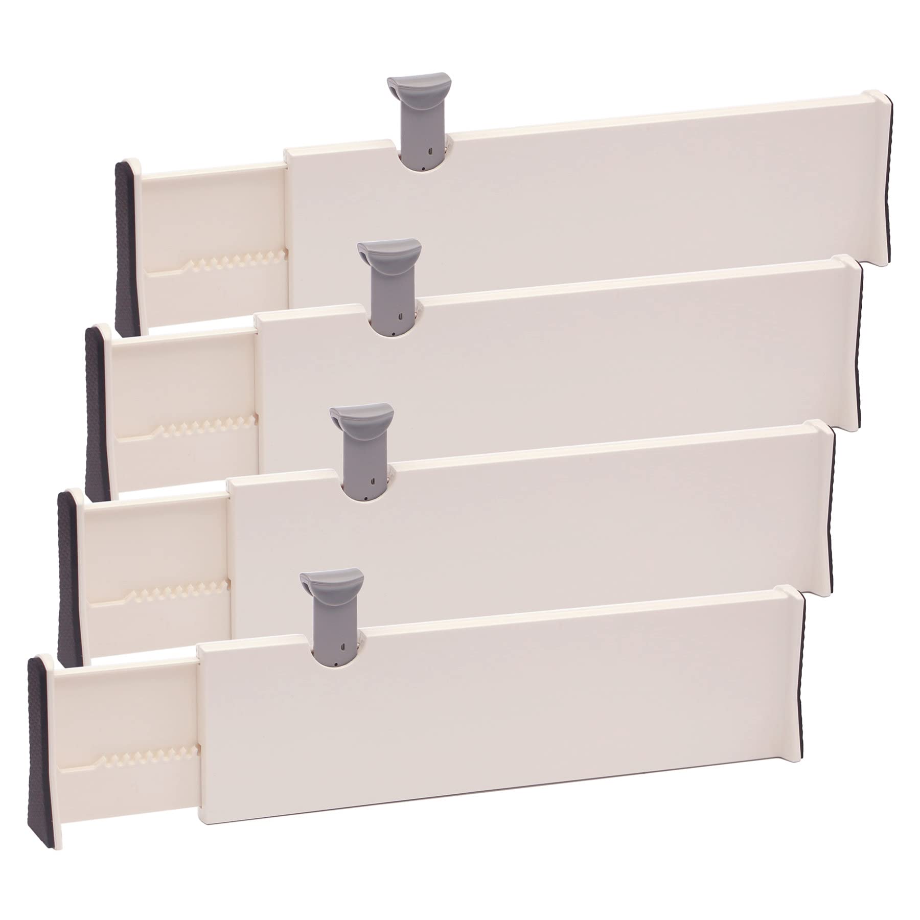• Set of 4. White. Expandable retractable design fits most drawers and cabinets front to back or side to side. Organize bedroom dresser drawers and nightstands in children, tween, teen and adult bedrooms and closets; Perfect for organizing junk drawers, kitchen utensils tool, office desk supplies, craft and art supplies, bathroom clutter and more; Use in home, apartment, condo, dorms, cabins, RVs and campers.