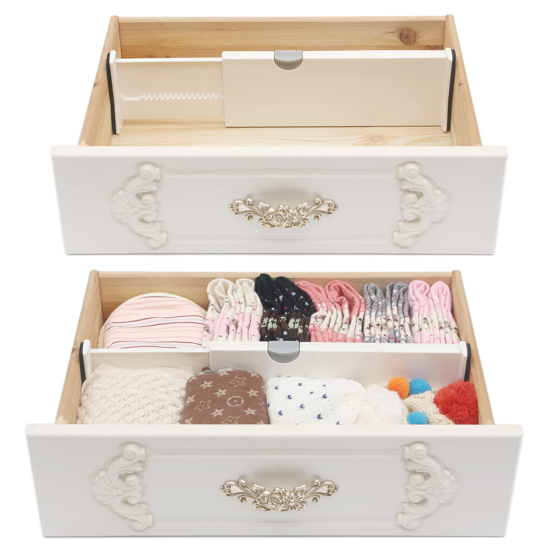 • Also can be used for drawer organizer, cabinet dividers partitions, desk drawer dividers, drawer separators, clothes, clothing, underwear, sock. Store and organize socks, women's leggings, sports bras, yoga pants, lingerie, tights, t-shirts, scarves, belts, accessories and more; The dividers expand to desired length and lock into place to keep everything situated; Customize your drawers to perfectly fit your storage needs.