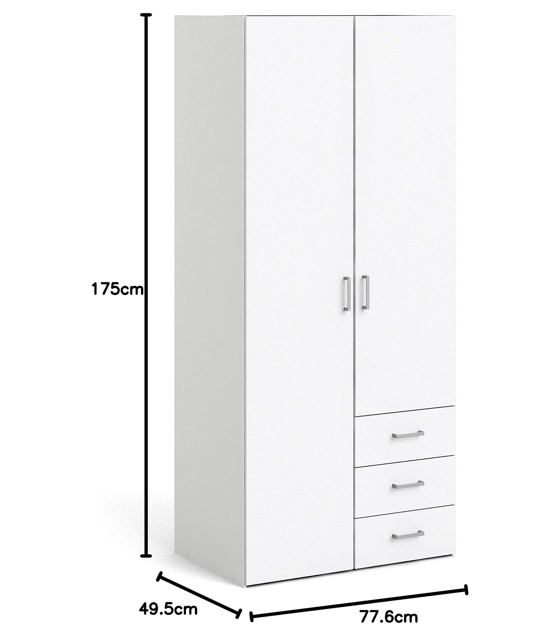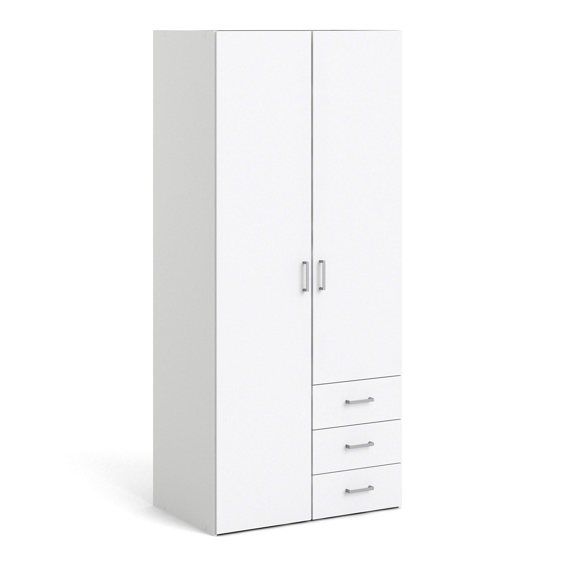 Organize your entire wardrobe with the versatile Modern Home Furniture To Go | Space Wardrobe. This large combination closet, in a clean white wood finish, offers a complete storage solution. It features a full-length 2-door section with a hanging rail and top shelf, plus an external stack of three spacious drawers. This all-in-one armoire provides a place for everything, from hanging dresses and suits to folded sweaters and accessories, making it a perfect centerpiece for a master bedroom.