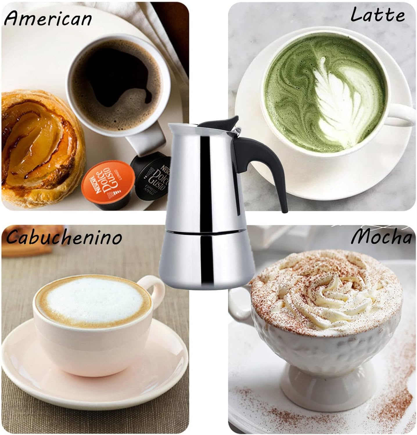 • Safe & Durable Materials: Constructed from high-quality, food-grade stainless steel, this espresso maker is 100% aluminum-free, ensuring a safe brewing experience. The ergonomic handle is heat-resistant for comfortable handling, preventing burns.