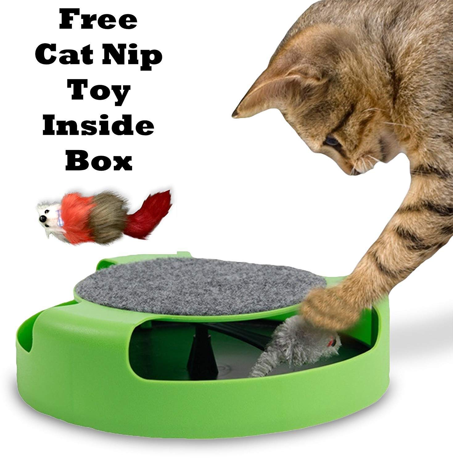 • Cats love trying to catch the spinning mouse inside this toy No batteries needed Natural motion charges up and makes the mouse spin Keeps cats active and engaged for hours Non slip rubber pads to protect floors