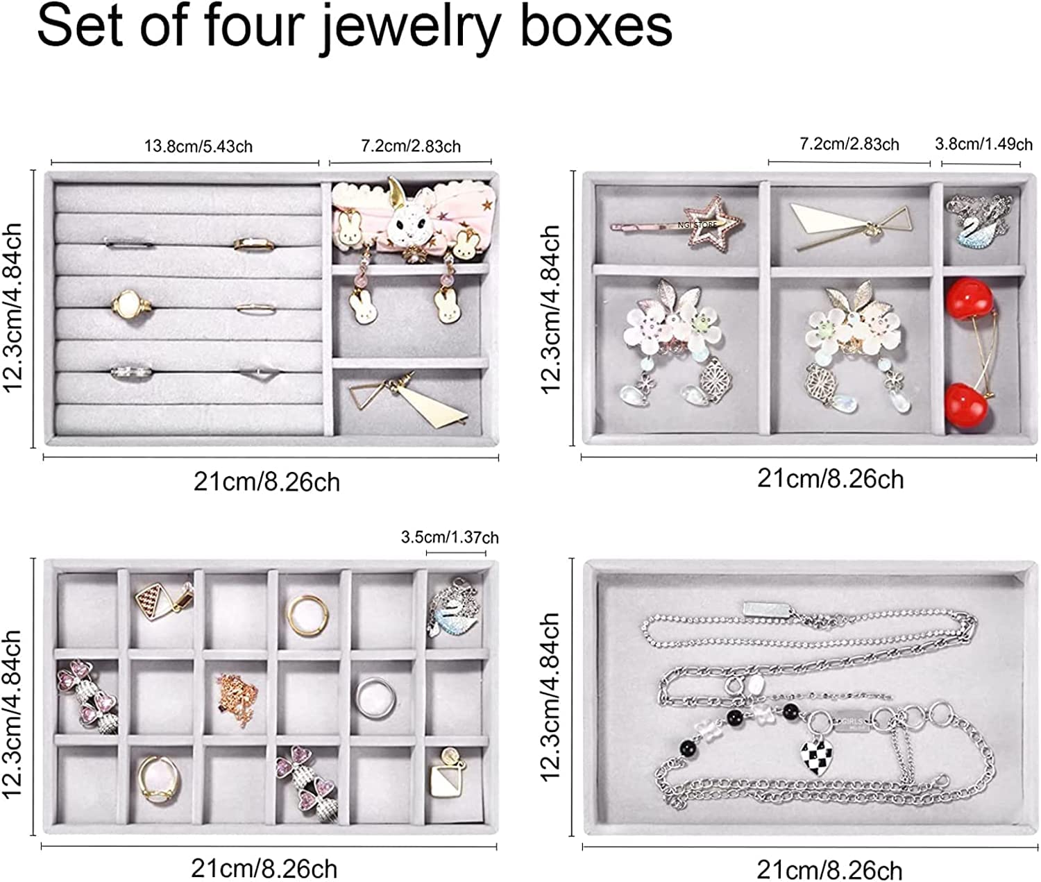 Velvet Jewelry Drawer Inserts Trays, Earring Organizer Stackable Jewelry Display Trays, Box Ring Holder Necklace Case, Storage for Bracelet Brooch Watch, Set of 4 (Gray)