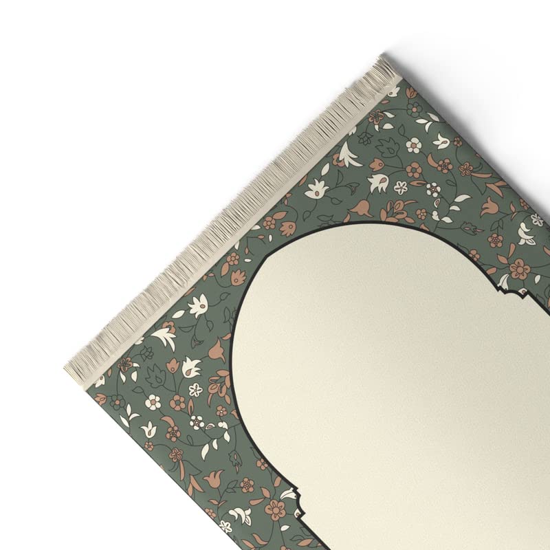 Velvet Prayer Mat in Beige and Olive, 68x117 cm, a luxurious rug with a beautiful mosque garden design, made from soft velvet for a comfortable and peaceful prayer experience