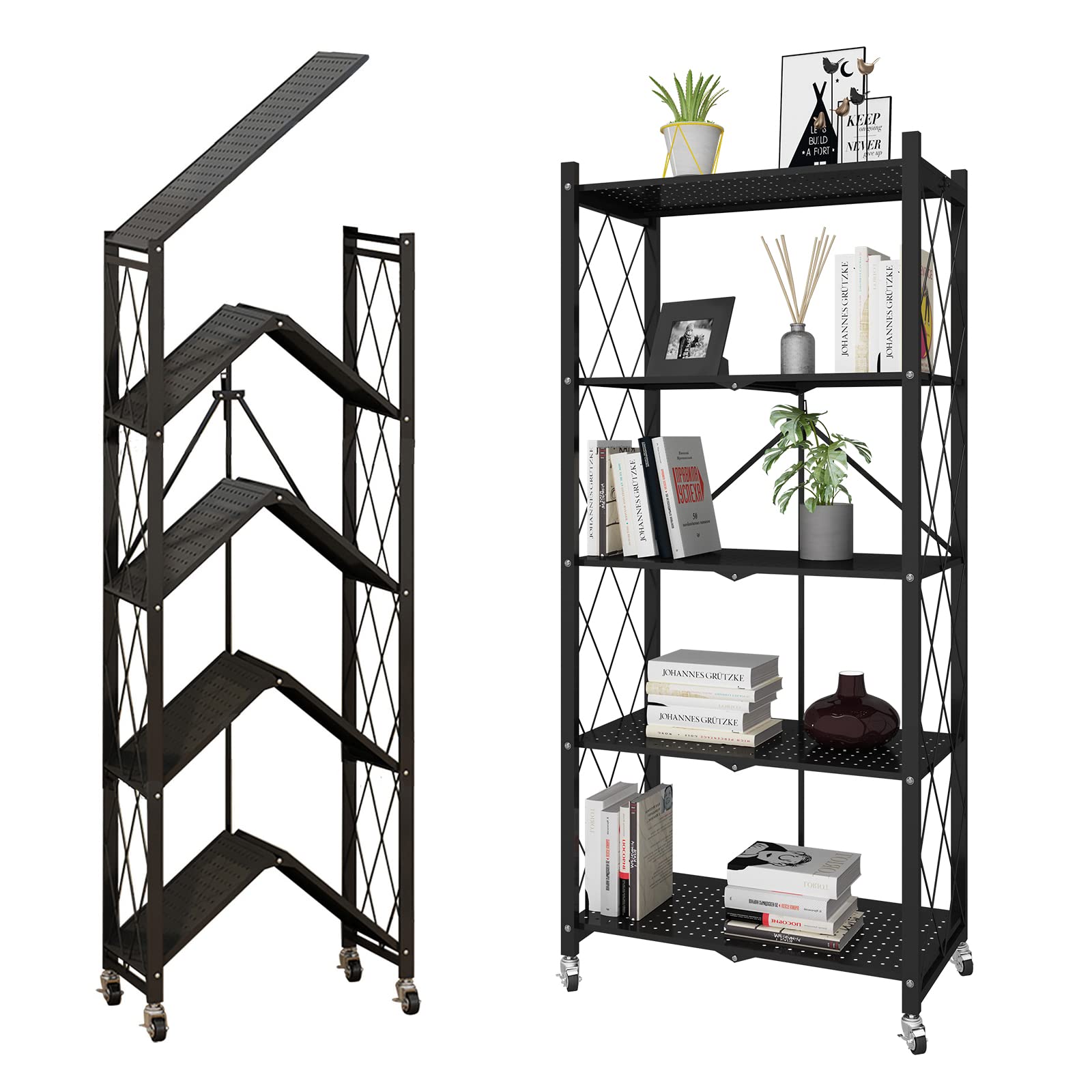 WHIFEA 5 Tier Foldable No Assembly Storage Shelves with Wheels 28.3’’15’’63.2’’ Free Standing Metal Wire Rack Heavy Duty Pantry Collapsible Organizer for Kitchen Bedroom Bathroom Office Black