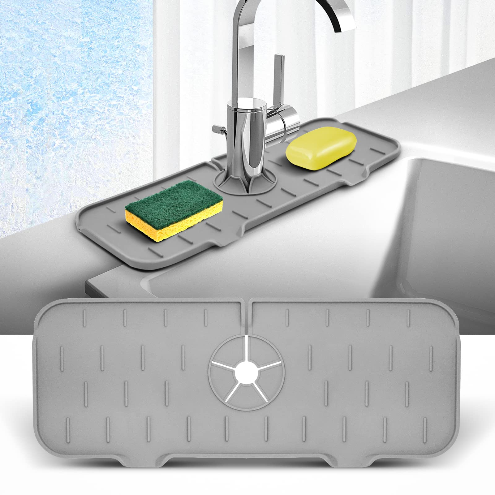 WINALLO Silicone Faucet Mat for Kitchen Sink Splash Guard Silicone Faucet Handle Drip Catcher Tray Sink Protector Pad for Countertop Kitchen Sink Bathroom Bar, Light Gray