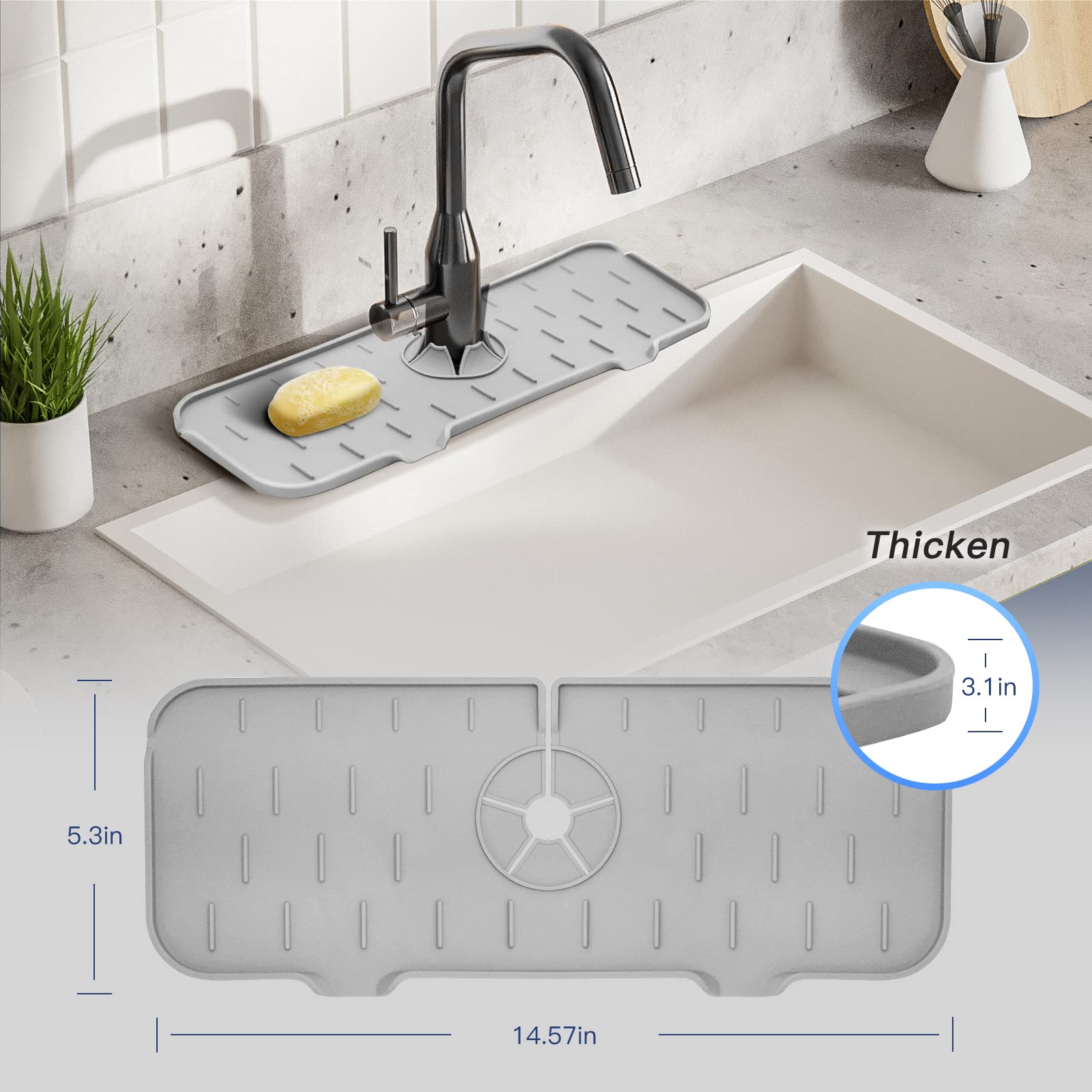 • Thick Silicone Raw Material - Adopt premium silicone as the raw material, 5*14.5*3 inches in dimension. Refuse the slim silicone mat, choose the thicken silicone sink mat as the upgraded generation to ensure the durability.