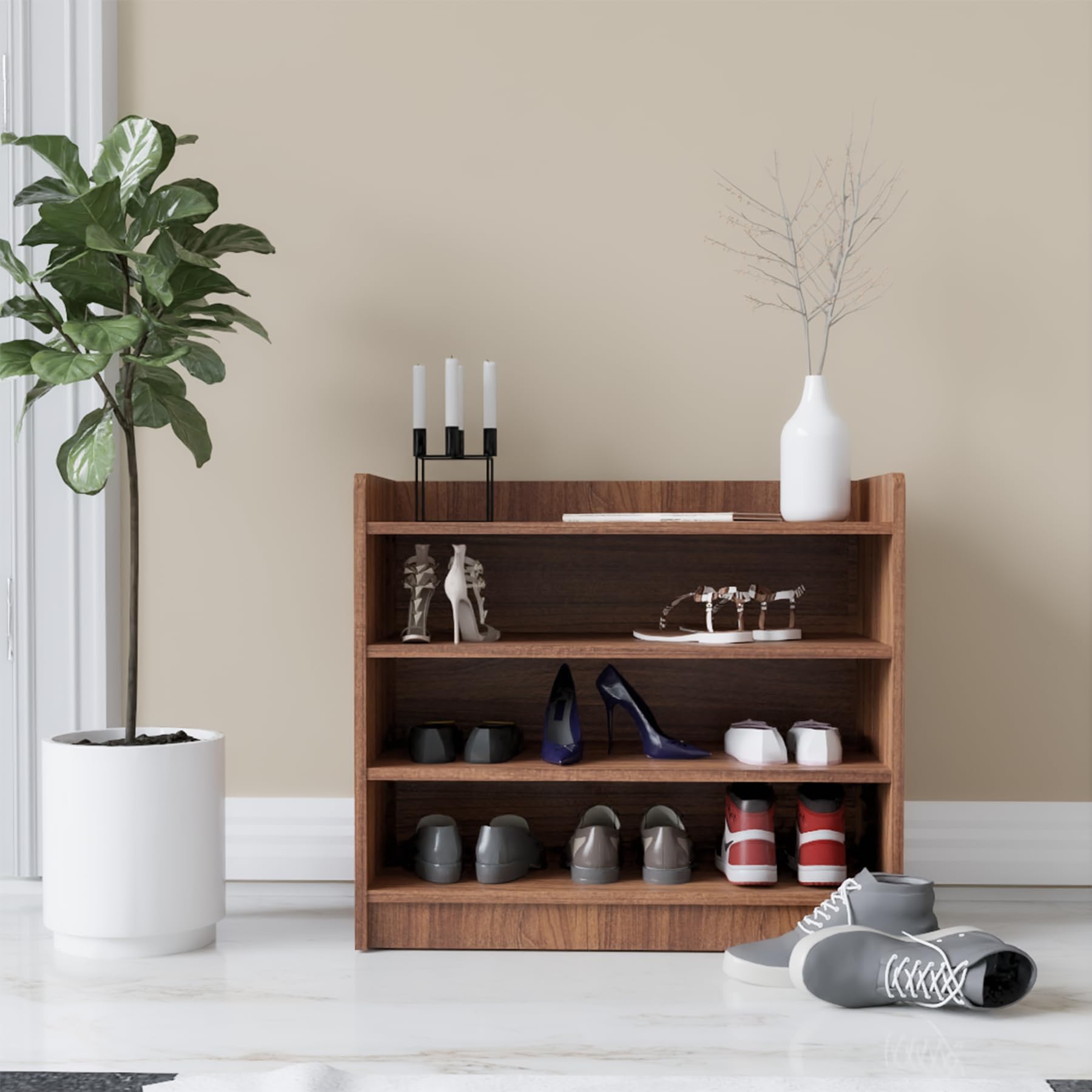 Keep your footwear collection tidy with the Modern Home COUCH CULTURE SKO Shoe Rack. This 4-shelf organizer, made from engineered wood in a classic brown finish, is designed to hold up to 15 pairs of shoes. Its open-shelf design provides easy viewing and access to your entire collection. The smart knock-down construction ensures a simple assembly process. It’s a practical and stylish wooden shoe rack that brings excellent organization to your entryway, closet, or bedroom with its high capacity.