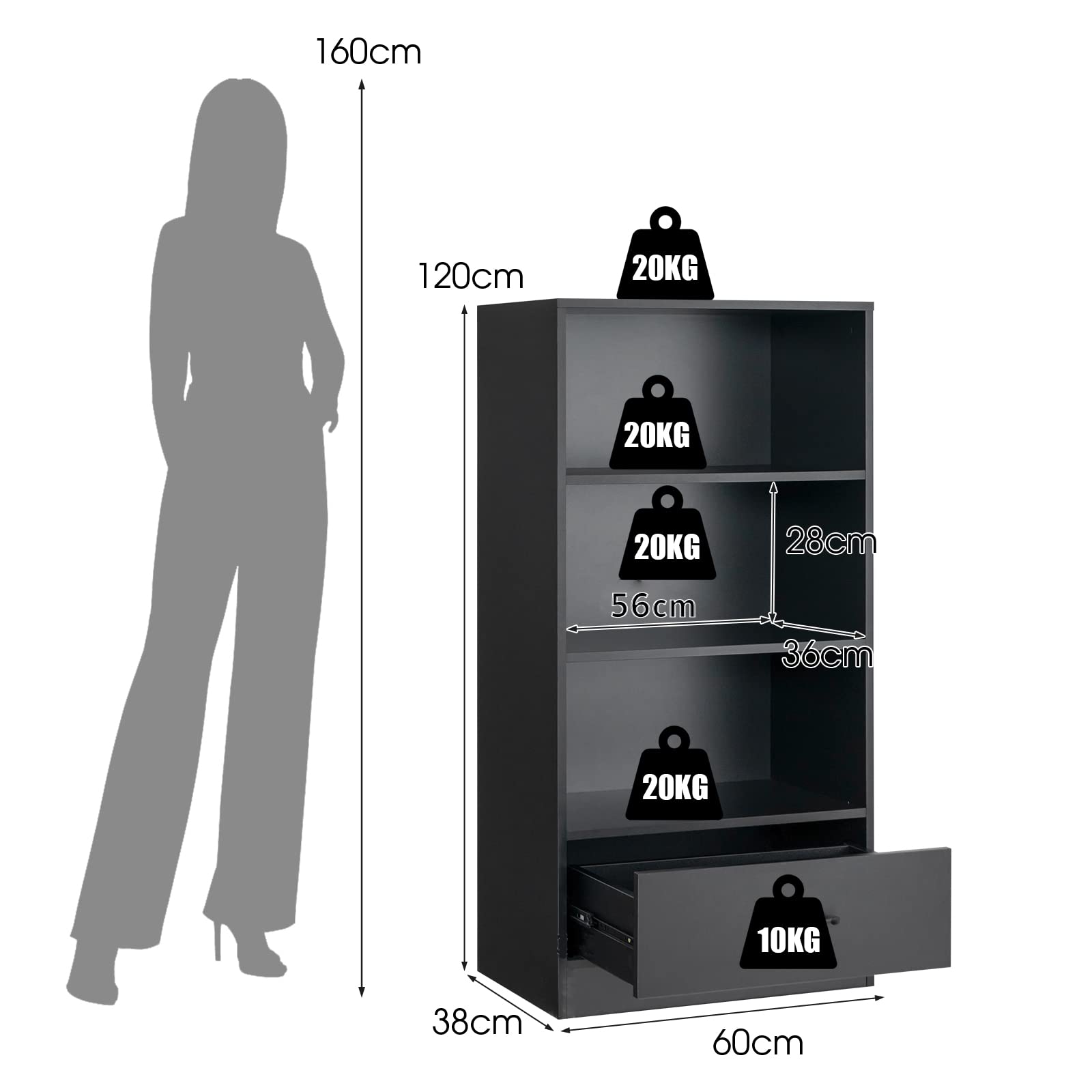 Combine open display and concealed storage with the Modern Home Wooden Bookcase. This freestanding unit, in a sleek black finish, features three open shelves perfect for showcasing books and decor, plus a spacious bottom drawer for tucking away clutter. It's a versatile storage cabinet and display rack ideal for a living room, bedroom, or office. The sturdy wooden construction ensures durability, making it a highly functional and stylish solution for modern organization and display needs.