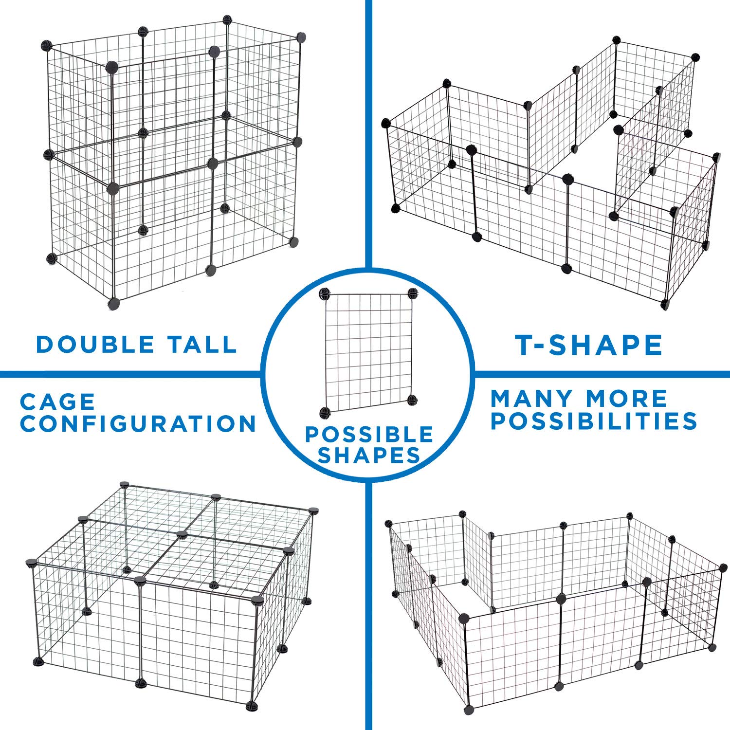 • 12 metal panels and 24 connectorsallows for multiple shape configurations; choose a low and large play area or a tall and enclosed crate.