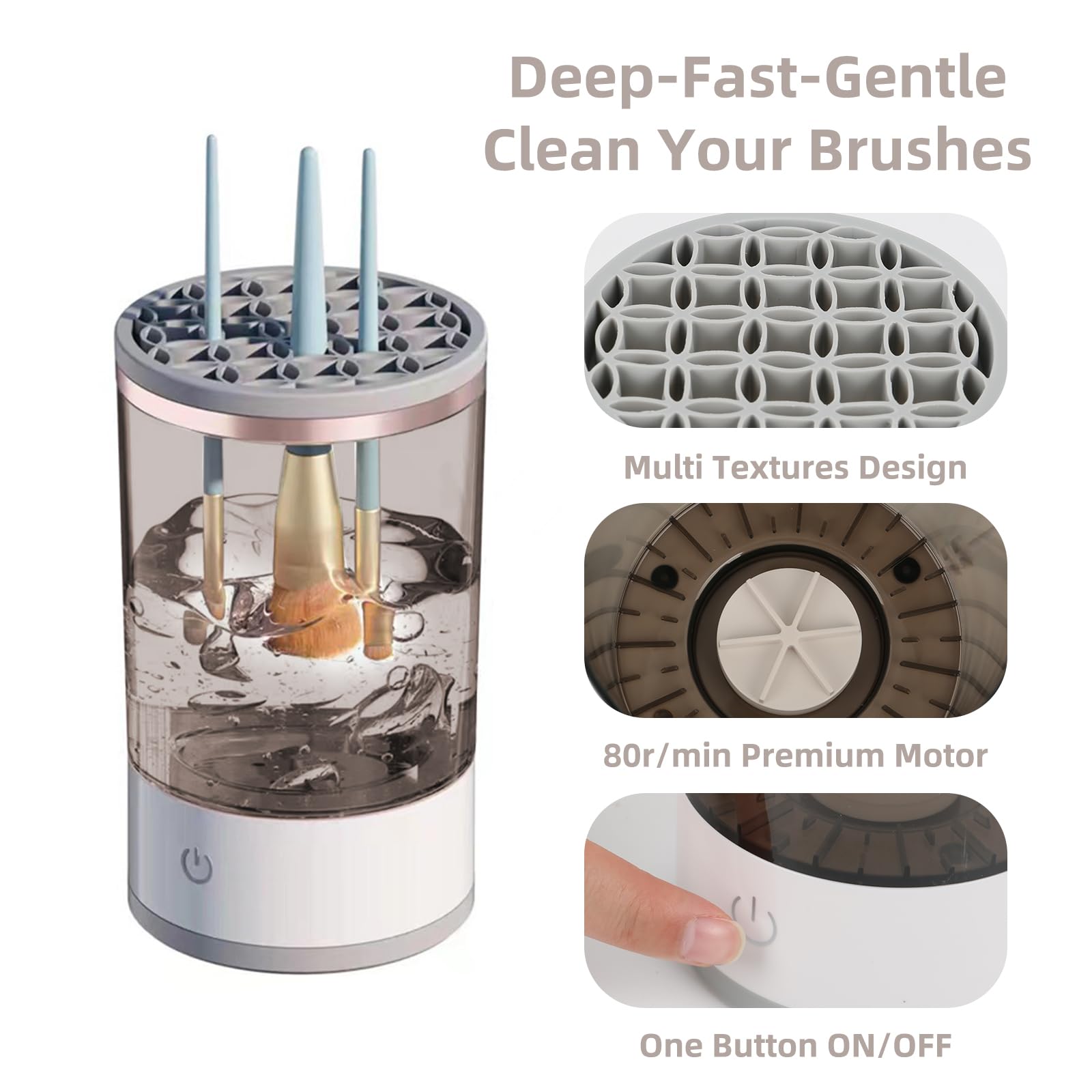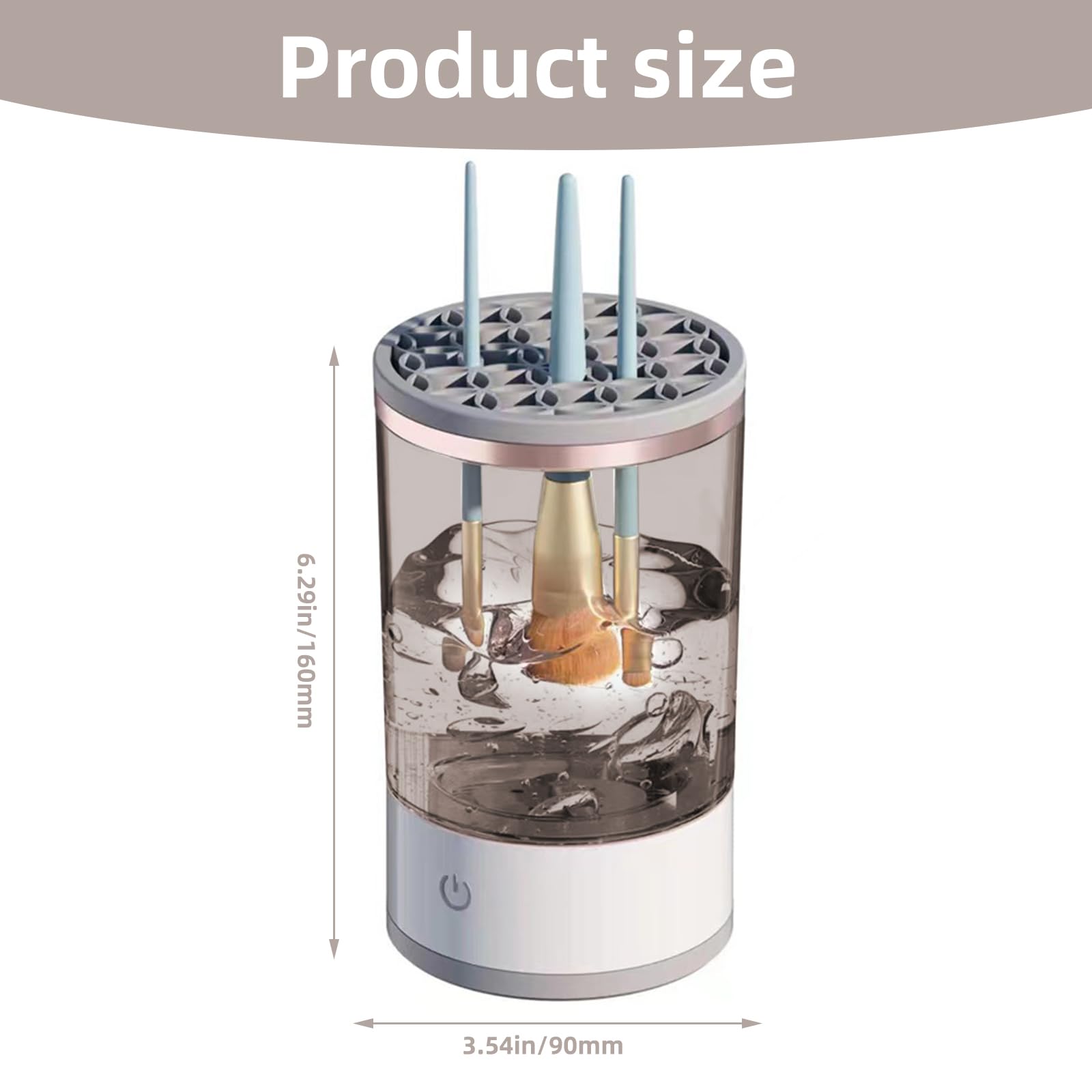 • Advantages This electric makeup brush cleaner is equipped with a rubber ring at the top, which is suitable for most makeup brushes on the market. Such as eye shadow brush, concealer brush, lip brush and so on. The design of the electric makeup brush cleaning machine can well prevent liquid from splashing around, giving you a better experience.