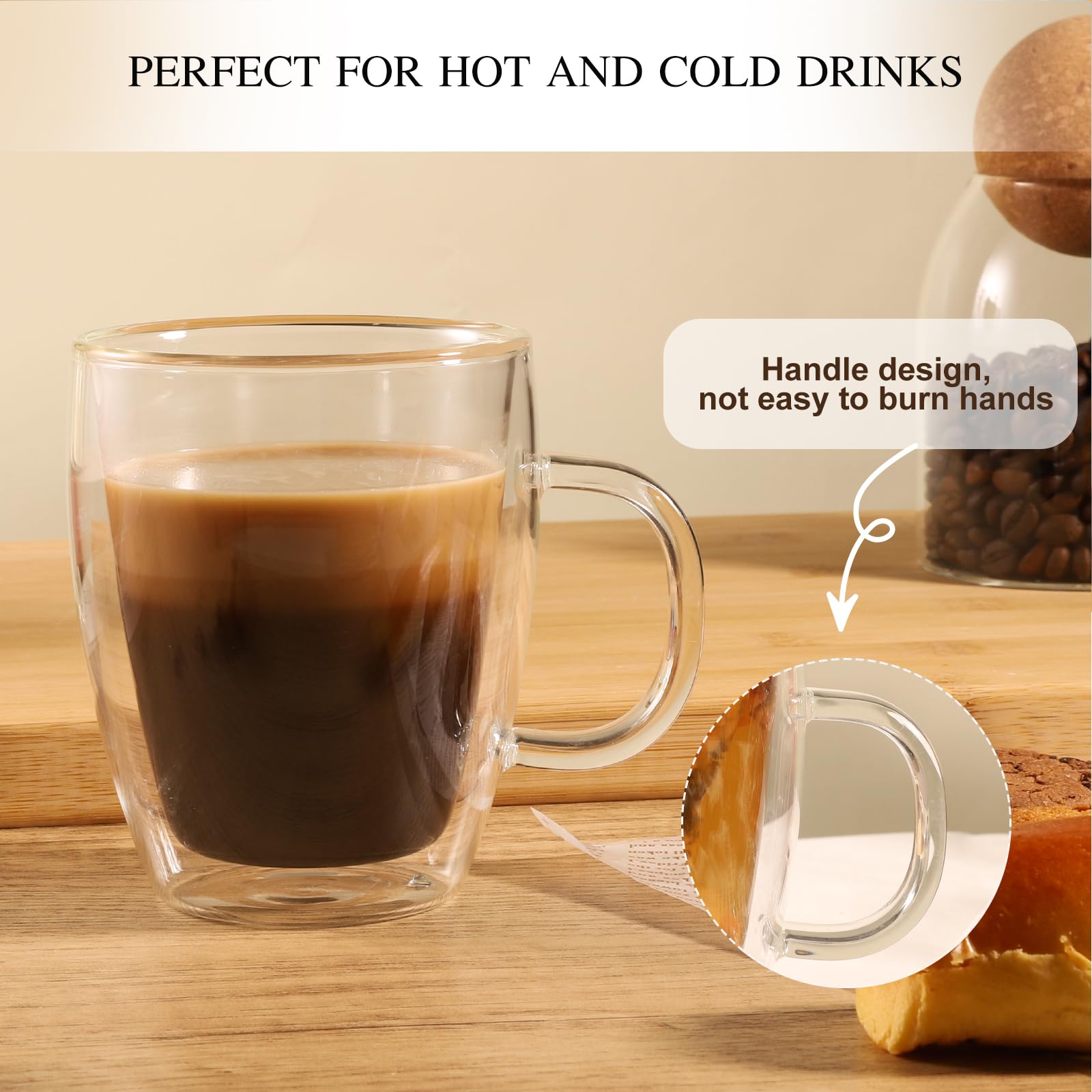 • Elegant Modern Design: Our sleek and modern mugs add sophistication to your coffee experience. The transparent double walls showcase the beverage's richness, creating an appealing presentation. The outer layer stays cool to the touch, enhancing safety and ensuring a comfortable grip, even with piping hot contents.