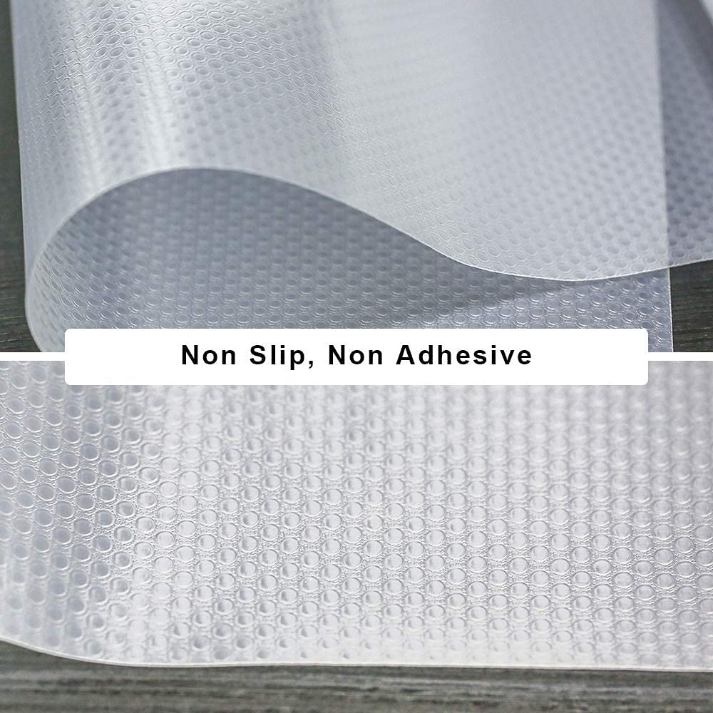 • 【Anti-slip function】The surface of our shelf liner is special designed with circular net.It look like a piece of finger pressure plate. This structure makes our product fit on the flat surface, reduce it move around due to you taking your staff.