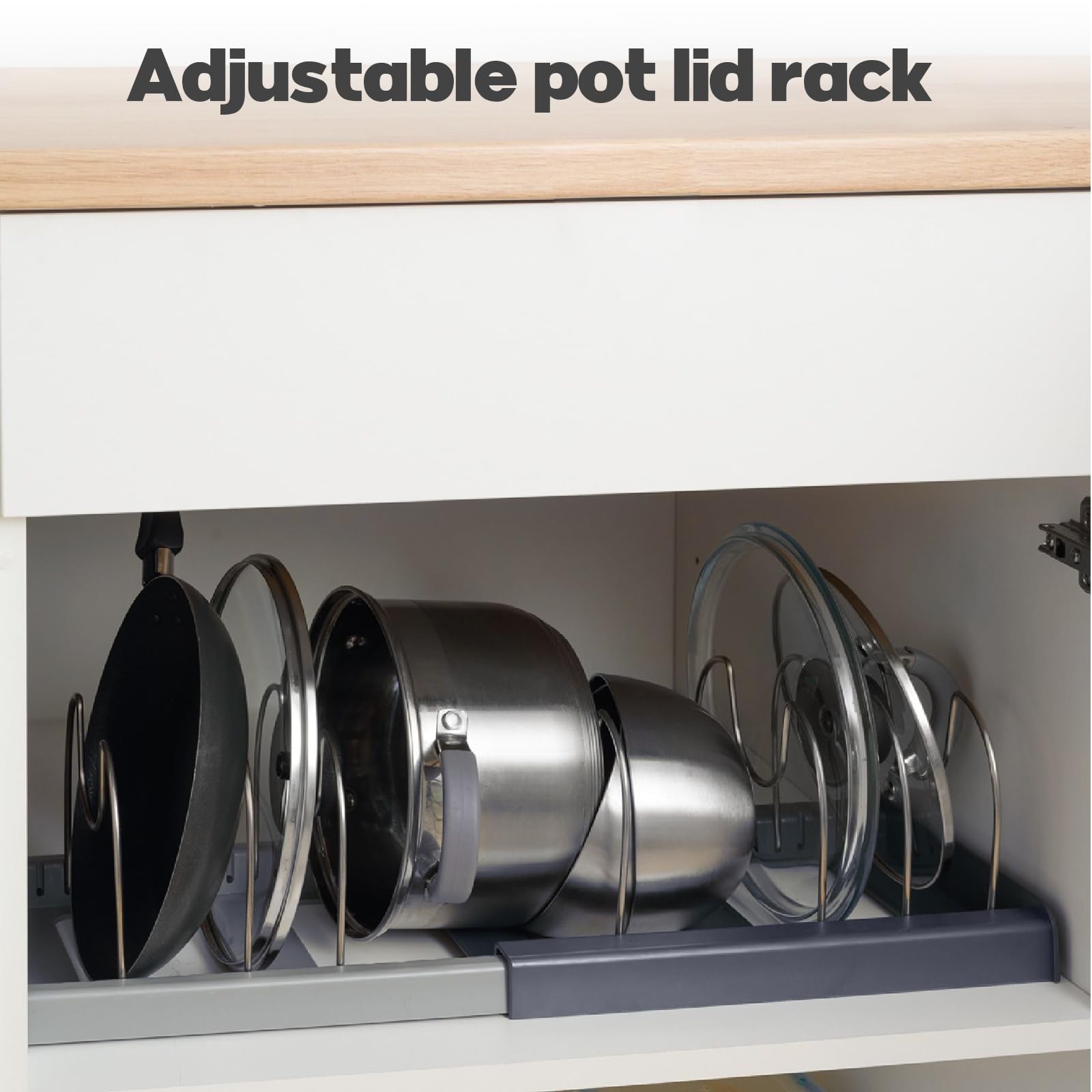 • KITCHEN STORAGE AND ORGANIZATION MADE EASY: Say goodbye to crowded cabinets and countertops! This adjustable pot lid holder not only keeps your kitchen tidy, it also allows easy and efficient access to and storage of your cooking utensils