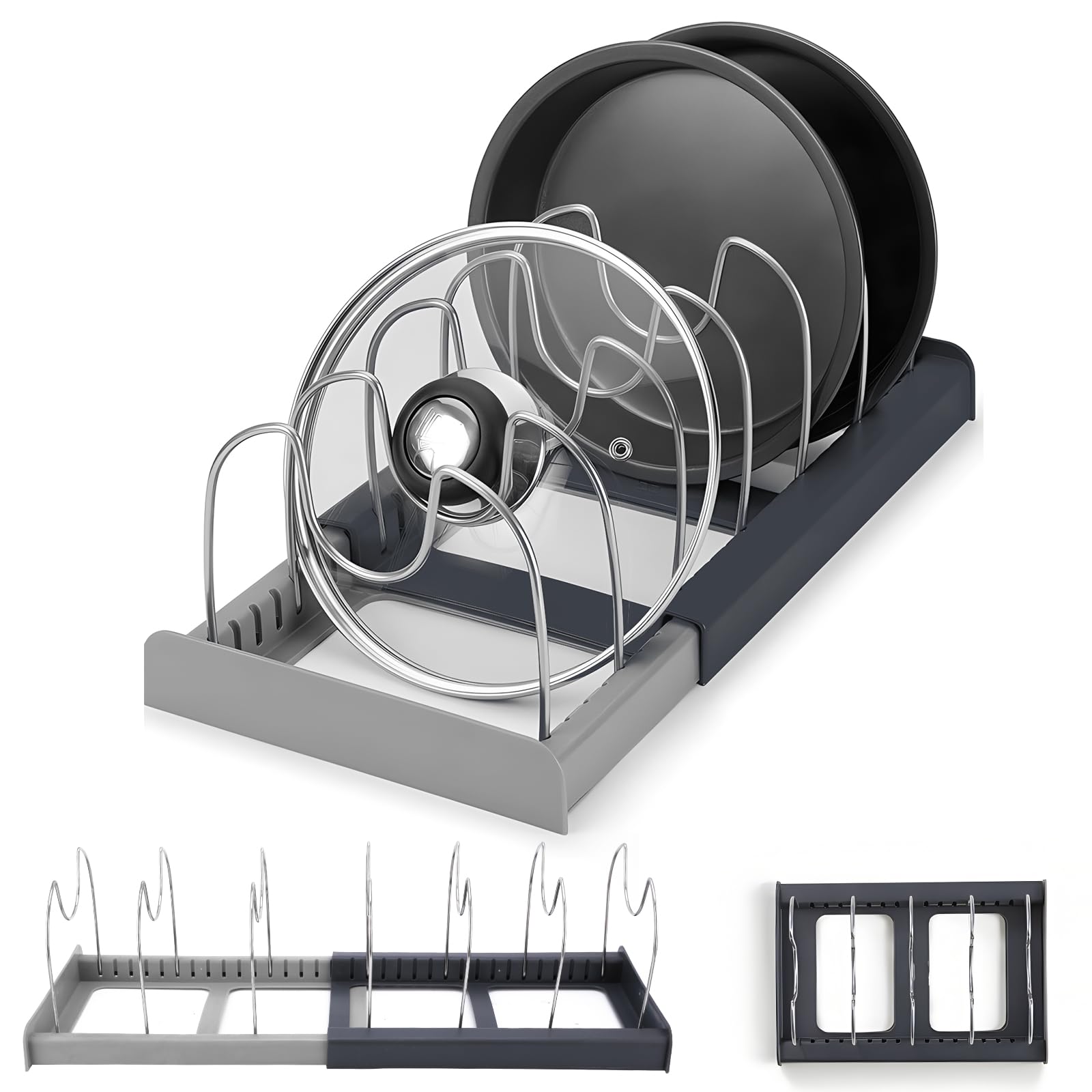 • Adjustable drawer pot organiser: the extendable bottom and adjustable dividers of the lid shelf drawer allow you to adjust the length to suit your cabinet size and your needs. Pot Lid Organizer It is perfect for storing heavy pans, large plates, cutting boards, trays and other baking moulds.