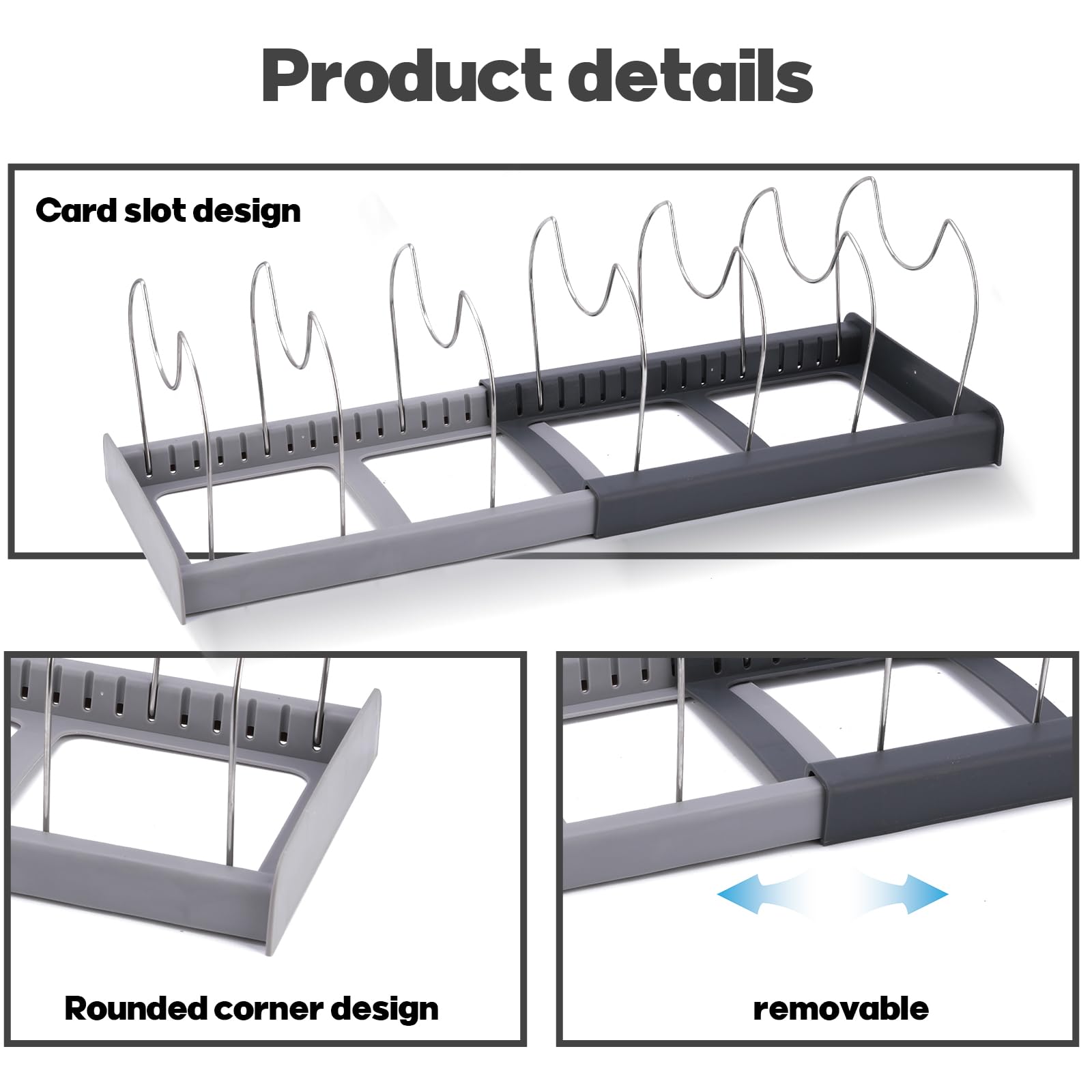 • 🛡️ Durable & Safe Pot Lid Holder The U-shaped back support of this pot lid holder keeps your kitchen utensils safe, and the pot lid organizer prevents them from falling from a high height, and protects your floors from damage.